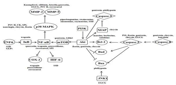 (3)天然輻射增敏劑能夠通過調節細胞周期蛋白cyclin D1和CDK4的水平,延長腫瘤細胞周期阻滯;也可通過調節MAPK、P13K/Akt等細胞凋亡途徑,調控氧化還原系統等多種分子機制發揮輻射增敏作用。