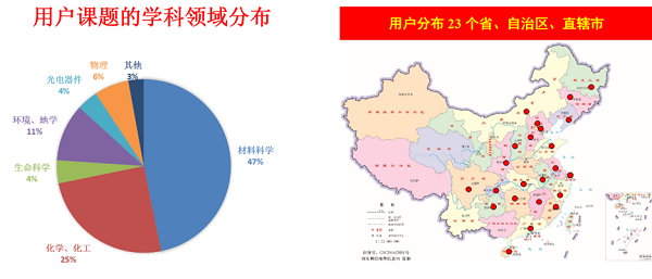 本次開放運行用戶課題的學科領域分布示意圖(左)及用戶分布示意圖(右)