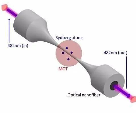 為了進行研究,科學家們使用了一種名為磁光陷阱的設備來捕獲一簇銣(Rb)原子團,將原子的溫度降低到絕對零度以上一度(約-272攝氏度),并讓納米纖維穿過原子云。然后,科學家們使用482 nm的光束穿過納米纖維,將銣原子激發到更高能量的里德堡狀態。這些圍繞納米纖維表面形成的里德堡原子,在尺寸上比普通的里德堡原子要大。當原子的電子獲得能量時,它們會遠離原子核,產生更大的原子。