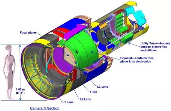 LSST相機(jī)是迄今為止建造的最大的數(shù)碼相機(jī)。它大約有5.5英尺(1.65米)乘9.8英尺(3米),大約相當(dāng)于一輛小型汽車的大小,重約6200磅(2800公斤)。它是一種大口徑、寬視場(chǎng)光學(xué)成像儀,能夠觀察從近紫外到近紅外(0.3-1μm)波長(zhǎng)的光。LSST相機(jī)設(shè)計(jì)能提供3.5度的視野,其10μm像素能夠進(jìn)行0.2弧秒的采樣,以優(yōu)化像素靈敏度和像素分辨率。