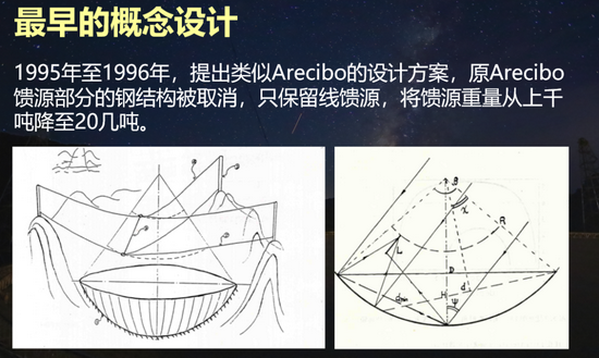 在最早的時候FAST就是參照Arecibo來進行的設(shè)計。其實,很多時候看到現(xiàn)在的FAST的樣子,都會跟Arecibo 聯(lián)系在一起。看看下面這張圖,是在上世紀(jì)95、96年的時候,F(xiàn)AST進行一些立項申請時候的手繪圖。從這里看到它幾乎就像一個Arecibo 的翻版,只不過把尺度變成了500米口徑,仍然考慮是一個球面,上面還是一個線饋。而當(dāng)時的概念有一個不同的地方,就是國內(nèi)的科學(xué)家非常大膽地想不再用幾個固定的鋼絲繩,而是用一個活動的鋼絲繩去牽引線饋來回的運動——在一個比較大的天區(qū)里面進行運動,不再建像他們那樣一個那么大的三角形的中間的鋼性框架。因為我們發(fā)現(xiàn),如果500米口徑的望遠鏡建成那樣子的框架,中間框架要上萬噸,根本沒有辦法建設(shè)。