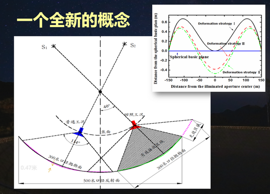 當(dāng)考慮到已經(jīng)可以把上面的部分活動了,那么下一步能不能把下面的反射面也活動一下,就是不再用一個球面的反射面,用拋物面,這可以最大限度地將拋物面中間的信號匯聚到焦點位置。那么如果一個500米口徑的望遠鏡只是一個拋物面的話,就代表我只能接受天區(qū)上面一個角度下來的信號,那怎么行。所以又換了一個概念。在300米的尺度范圍之內(nèi),當(dāng)選擇了合適的焦比,從拋物面到球面的一個變形量是不到半米的。我們能不能去建一個可以實時活動的拋物面,雖然是500米口徑,但現(xiàn)在的瞬時的有效的接收面積是300米,就在這300米的范圍之內(nèi)把它從球面變成拋物面,然后最大程度地把這300米范圍之內(nèi)的能量全部接收進來,是不是就可以來實現(xiàn)最新的一個概念。有了當(dāng)時的一個設(shè)計圖,底下的反射面可以實時的進行變形,當(dāng)它變形可以想象500米口徑的球面里面,可以變形成無數(shù)個300米口徑的拋物面,那么這無數(shù)個300米的拋物面,它的焦點就會變成一個焦面,焦面會位于整個反射面上方140米到170米,開口口徑在206米的一個球冠面。