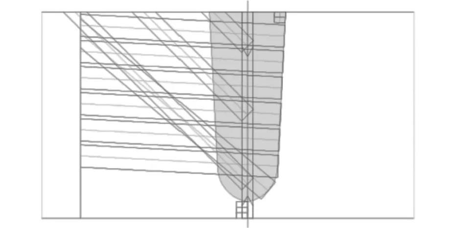 分區法檢測技術依據焊縫的坡口形式設置焊縫根部、熱焊、填充及蓋面等分區,每個分區高度為1~3mm,同時采用超聲衍射時差法(TOFD)及體積檢測通道,以提升不同類型缺陷的AUT檢測能力及定量精度。每個分區設置獨立的檢測波束,其以焊縫中心線對稱布置,波束設置如圖2所示,并有效覆蓋焊縫中心,實現焊縫檢測區域的有效檢測,檢測結果以帶狀圖的方式顯示,如圖3所示。