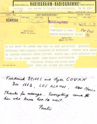 在五個多月的時間里,萊因斯和考恩收集數據并分析結果。終于,在1956年6月,他們給泡利發了一封電報:"我們非常高興地通知您,我們已經確切地探測到了中微子。"