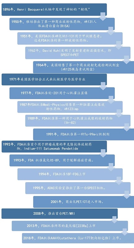 國際核醫學起源于十九世紀末,經過漫長的研究發展,于1951年正式開始進入臨床。國內的核醫學起步較晚,1956年我國制定了12年科學遠景發展規劃,其中“同位素在醫學中的應用”被列為國家重點科研項目,同年,首個同位素訓練班誕生,研制出第一批放射性標記物并建立了初步的醫用放射性核素與藥物生產線。1987年研制出99mTc標記藥盒,1994年研制出質子回旋加速器,可以批量生產18F核素,之后國內核醫學快速發展,SPECT及PET/CT等設備的國產生產商不斷涌現,核醫學設備國產化開始。