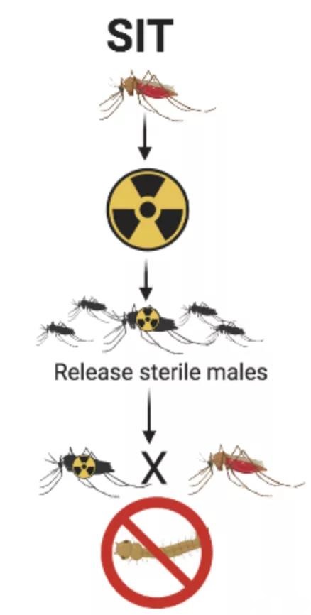 這里的核技術是通過核輻射讓蚊子不孕不育,這種方法叫做SIT(Sterile Insect Techniques)