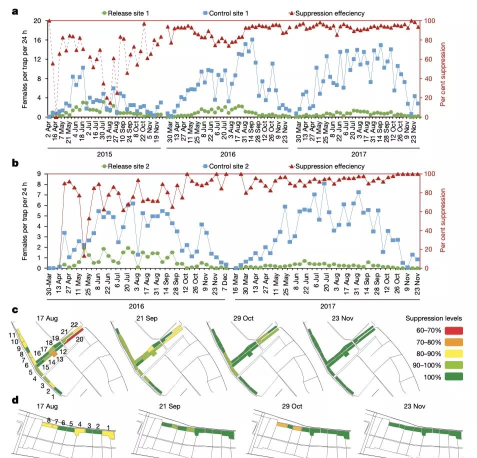 通過在 2-3 年間持續釋放絕育蚊子,最終每年野生蚊種的數量平均減少 83% ~ 94%, 且在長達 6 周內都偵測不到任何蚊子,當地蚊子種群被基本消除。