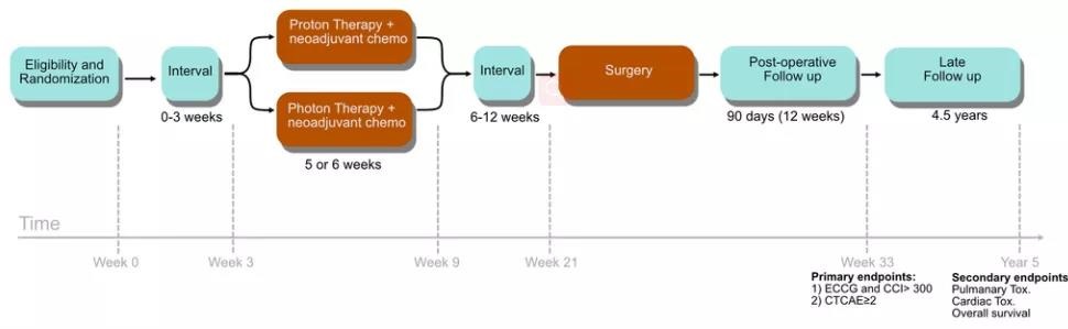 在CROSS試驗之后,nCPT和nCXT包含每周卡鉑和紫杉醇化療,持續5周。放療處方劑量為41.4 Gy/23 fx或50.4 Gy/28 fx。實際方案的劑量水平將滿足不同臨床偏好和國家指南建議,以使整個歐洲機構廣泛接受試驗,獲得最優收益,促進將試驗結果廣泛轉化為臨床實踐。