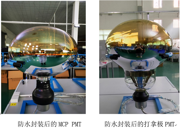 2019年7月,在對防水封裝設計方案和加工工藝進行了長期研究和優化以后,江門中微子實驗PMT測試與防護組在廣東省中山市 “PMT測試與封裝工作站”正式開始PMT的批量封裝。防水封裝實驗室面積超過600平方米,擁有10余名經過嚴格訓練的專業人員,可同時進行300支PMT的封裝操作。封裝采用流水線方式,因密封膠固化后不可拆除,封裝步驟不可逆,操作人員必須嚴格按標準流程進行操作。每支PMT從第一步工序到完成最后一步共需要6天時間完成,最后進行檢漏,保證每一支PMT的防水密封都是可靠的。為確保封裝后的PMT正常工作,隨機抽取部分PMT進行了二次性能測試。