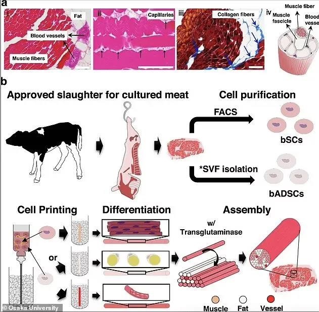 據悉,該團隊用兩種類型的干細胞,即牛衛星細胞和脂肪干細胞,在實驗室條件下將這些“多能”細胞誘導生長成各種類型的細胞。然后利用生物打印技術,制造出肌肉、脂肪和血管。