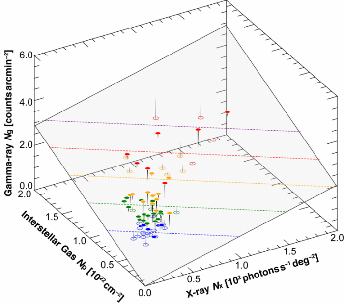 這項研究的原創性在于,伽馬射線輻射是由質子和電子成分的線性組合來表示的。天文學家知道一個關系,即質子的伽馬射線強度與通過無線電線成像觀測得到的星際氣體密度成正比。另一方面,來自電子的伽馬射線也被認為與來自電子的X射線強度成正比。因此,他們把總的伽馬射線強度表示為兩個伽馬射線成分的總和,一個來自質子源,另一個來自電子源。這導致了對三個獨立觀測點的統一理解(圖2)。
