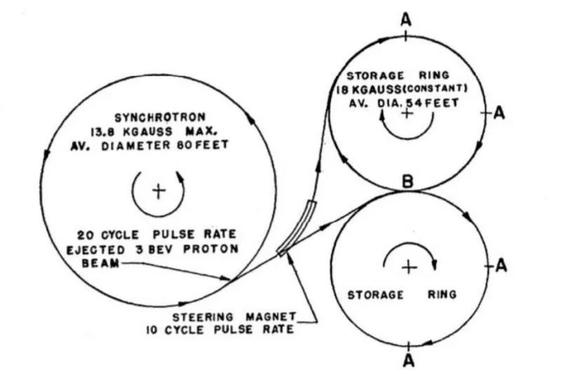 于 1953 年發表的對撞機的想法似乎引發了大量建議方案和文章 [1]。1956 年 4 月,Kerst 等人發表了“通過粒子束相交獲得極高能量”[2],如圖 4 所示。1956 年 6 月,O'Neill發表了“用于高能物理研究的存儲環同步加速器裝置”[3],如圖 5 所示。