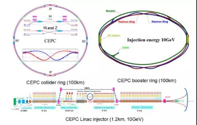 2012 年 7 月 4 日在歐洲核子研究中心的大型強子對撞機(LHC)上發現了希格斯玻色子,這一發現對未來加速器提出了新需求。由于希格斯玻色子的質量低,除了可以采用直線正負電子對撞機(見后面討論),還可以在環形正負電子對撞機的多個(≥2)探測器中產生大量“干凈”的希格斯玻色子并通過精確的實驗對標準模型中和超出標準模型的新物理進行研究、探索與發現。2012 年 9 月,中國科學家提出了在中國建造一個希格斯工廠,即未來環形正負電子對撞機(CEPC)[12-15],如圖 26 所示,每個對撞點的亮度在希格斯能量時為 5*1034cm-2s-1,在 Z-pole 能量亮度可達 100*1034cm-2s-1。2013 年,CERN 提出了未來環形對撞機(FCC)方案 [16]。CEPC 和 FCC 的周長均為 100 公里。CEPC 和 FCC 分別于 2018 年和 2019 年完成概念設計報告。