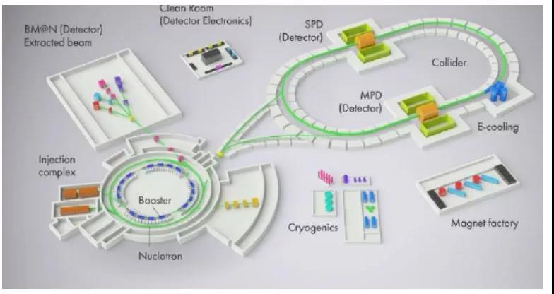 NICA 是杜布納聯合核子研究所 (JINR) 的一個離子對撞機項目,如圖 35 所示 [24]。NICA 的科學目標是相對論核物理學;中高能范圍的相互作用粒子的自旋物理及放射生物學。2016 年 3 月 25 日 NICA 正式開工建設,2022 年全面竣工。