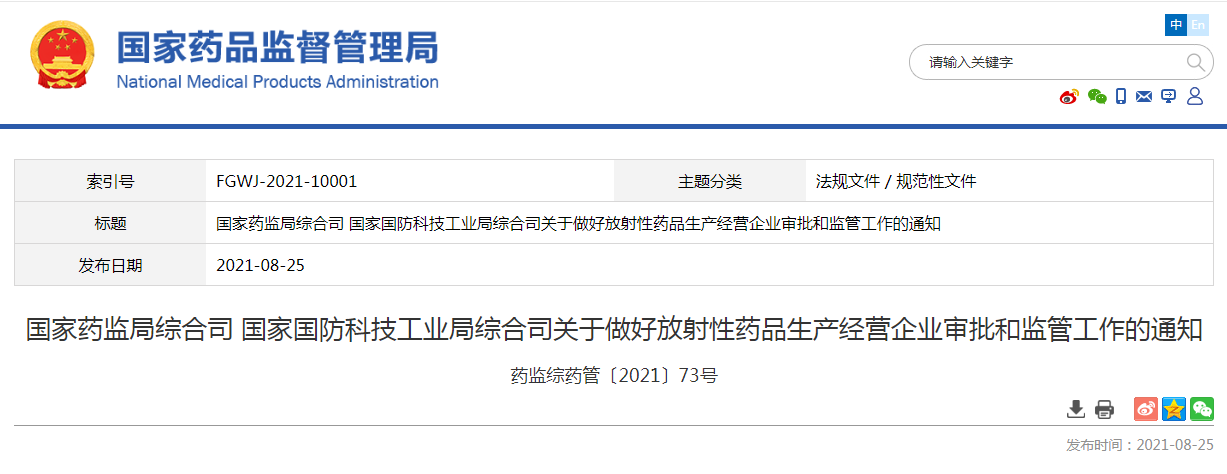 近日,國務院印發《關于深化“證照分離”改革進一步激發市場主體發展活力的通知》(國發〔2021〕7號),將放射性藥品生產經營企業審批權限由國家藥品監督管理局和國家國防科技工業局下放至省級藥品監督管理部門和省級國防科技工業管理部門。為貫徹落實國務院決定,切實做好放射性藥品生產經營企業審批和監管工作,現將有關事宜通知如下: