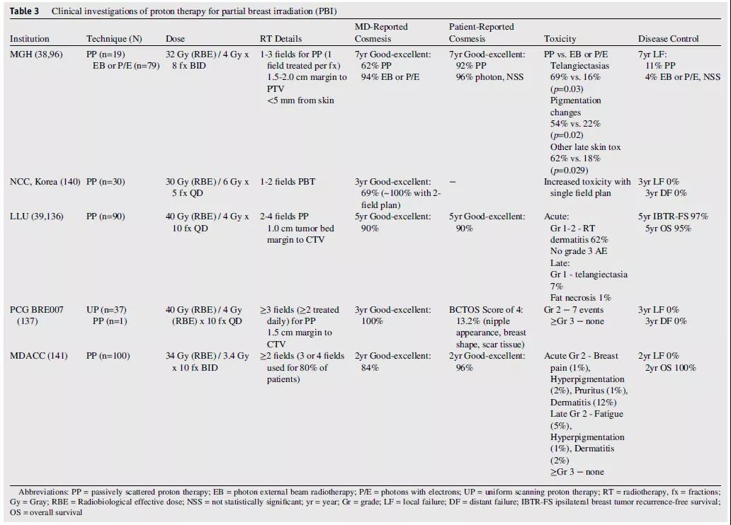一些前瞻性質子APBI研究結果已被報道(表3)。Loma Linda大學的研究人員進行了一項II期臨床試驗,其中100例患者接受了多野、俯臥位、被動散射質子治療,總劑量為40 Gy(RBE),分次數(shù)為10次。中位隨訪時間5年,乳腺內無復發(fā)生存率為97%,無≥3級急性皮膚毒性反應。晚期毒性只有7例1級毛細血管擴張。隨訪的5年中,超過90%的患者接受了美容治療;患者報告的美容效果相對良好,無隨時間惡化的證據(jù)。一項多中心Ⅱ期合作研究采用相同劑量分割方案,3年的隨訪結果也展示出相對良好的結果。