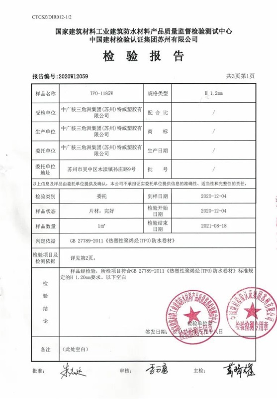 防水卷材作為直接在屋面外露使用的材料,因長期暴露在室外環境中,受到酸雨、高溫、紫外線照射等作用,容易使卷材老化并伴隨物理性能下降,從而導致防水能力下降甚至失效。因此,TPO防水卷材的耐老化性能顯得尤為重要,中廣核(蘇州)特威塑膠前期已成功研制出滿足2500h人工氣候加速老化的TPO防水材料TPO-1085W,市場反應良好,訂單數量較大。為滿足更高技術標準的TPO防水卷材材料的需求,開拓TPO高端應用市場,中廣核(蘇州)特威塑膠與中廣核(蘇州)科技公司聯合開發的滿足5000h人工加速老化的TPO防水卷材材料TPO-1185W已于今年8月取得中國建材檢驗認證集團蘇州有限公司的合格檢測報告。這標志著我司TPO系列產品在人工氣候加速老化性能方面取得重大突破,在國內TPO行業處于領先地位,已具備向高端TPO市場進軍的前提條件。