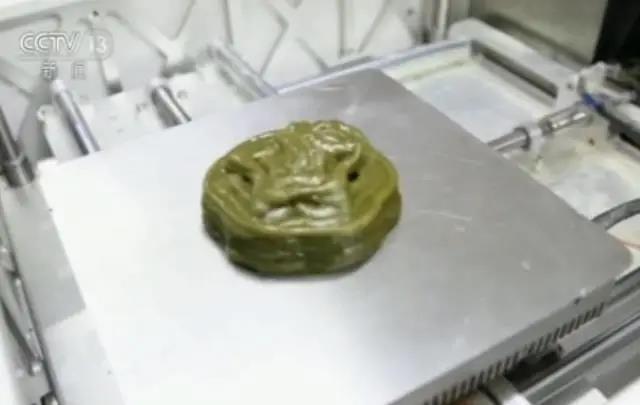 科研人員示范打印一個(gè)美味的傳統(tǒng)佳肴:月餅。科研人員先將面粉和水分別注入3D打印機(jī),輕輕一按,月餅就開始制作了。同一般的食物3D打印機(jī)不同,這款3D打印機(jī)可以在通過溫度控制,在原材料出口就進(jìn)行了多次加熱,這是整個(gè)食物打印機(jī)的關(guān)鍵。