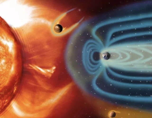 (上圖所示)理想化了太陽風(fēng)如何塑造金星(上)、地球(中)和火星(下)的磁層。與金星和火星不同,地球有一個(gè)內(nèi)部磁場,當(dāng)太陽風(fēng)的帶電粒子離開太陽時(shí),它們會(huì)偏轉(zhuǎn),在地球周圍產(chǎn)生了一個(gè)“氣泡”-磁層?;鹦呛徒鹦?,不會(huì)產(chǎn)生內(nèi)部磁場,太陽風(fēng)的主要障礙是高層大氣,即電離層。就像在地球上一樣,太陽紫外線將電子從這個(gè)區(qū)域的原子和分子中分離出來,形成了一個(gè)帶電的電離氣體區(qū)域:電離層。