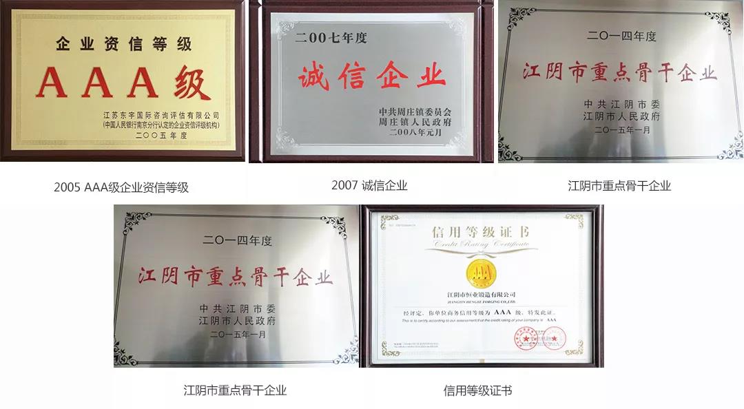 公司先后獲得2005年度AAA級企業資信等級、2007年度誠信企業、2008年底節能減排先進單位、江陰市重點骨干企業、AAA級信用等級證書。