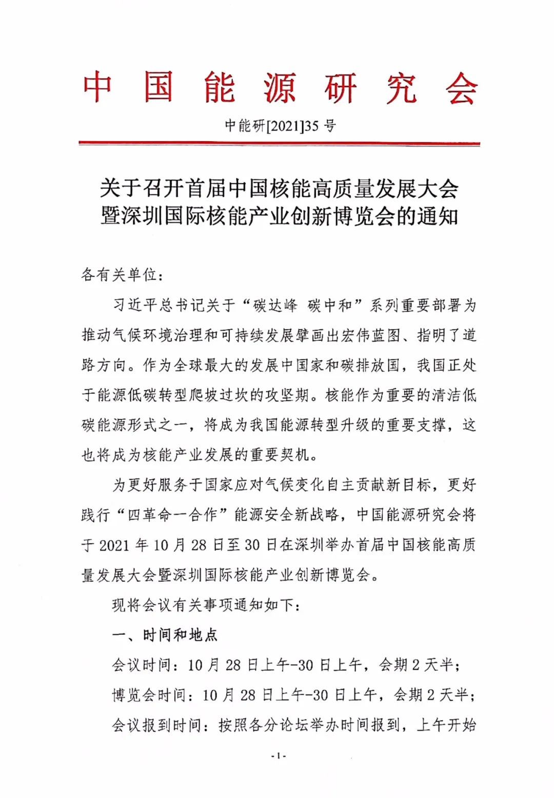 關于召開首屆中國核能高質量發展大會暨深圳國際核能產業創新博覽會的通知