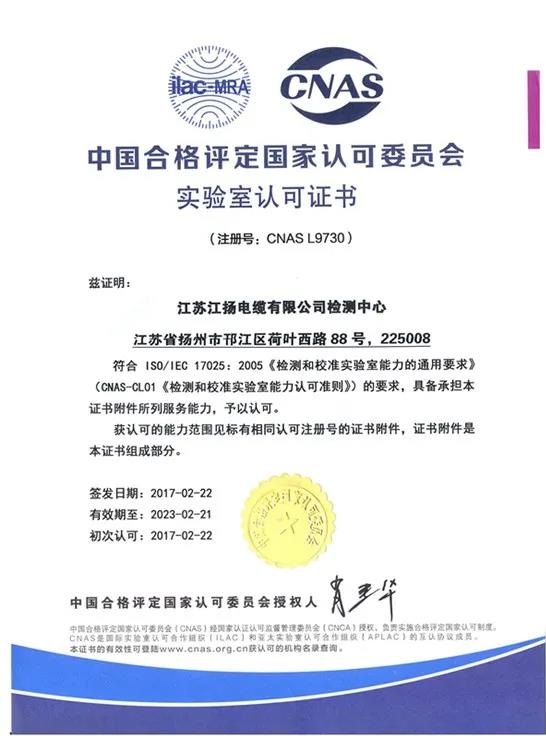 江揚電纜已通過ISO9001質量管理體系、ISO14001環境管理體系、OHSAS18001職業健康安全管理體系、ISO10012測量管理體系和GB/T29490知識產權管理體系等認證,產品實驗室更是獲得CNAS認可。