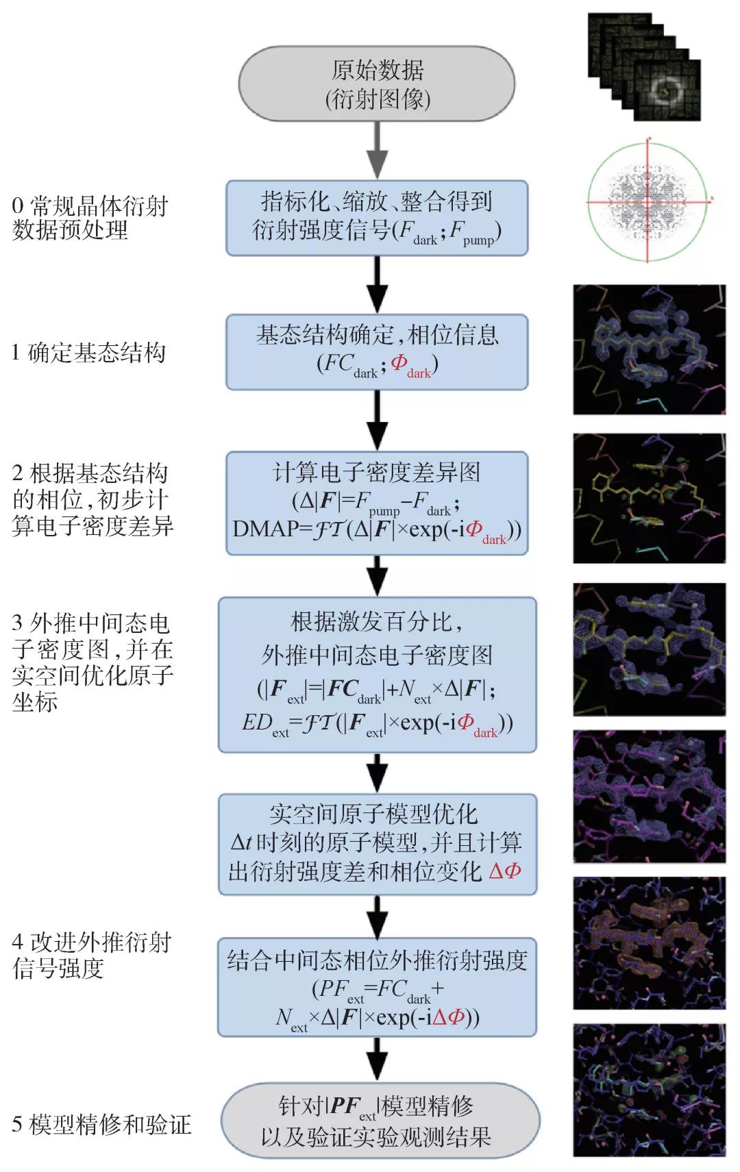 在2017、2018年兩次(共7天)實驗中,我們首先收集了光照之前的晶體衍射信號(需要指出的是,為了保證蛋白質分子處于基態(tài),樣品的制備是在暗室中進行的);然后用“泵浦—探測”的方式,收集了光脈沖激發(fā)之后1 ps到25 ms之內多個時間點的信號,累積超過100 TB的原始數據。接下來就需要“專業(yè)的剪輯師”上場,對這些數據進行系統(tǒng)、細致的分析。