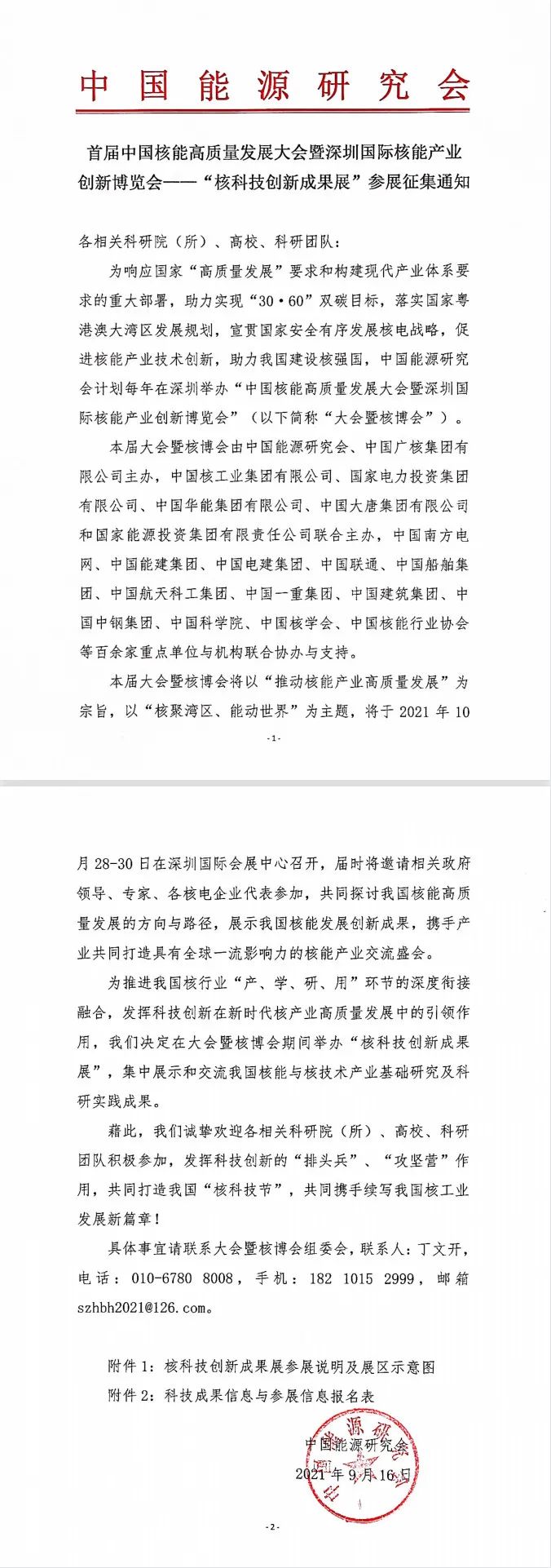 首屆中國核能高質量發展大會——“核科技創新成果展”參展征集通知