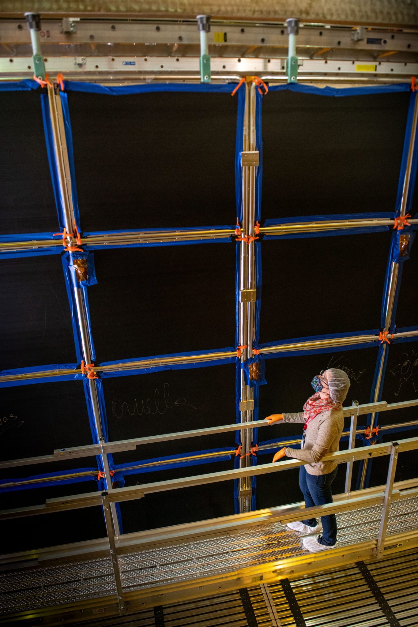 9 月,Anne Schukraft 在短基線附近探測器上查看電隔離支撐吊架,該吊架懸掛陰極的重量并從上方連接組件。照片:Ryan Postel,費米實驗室