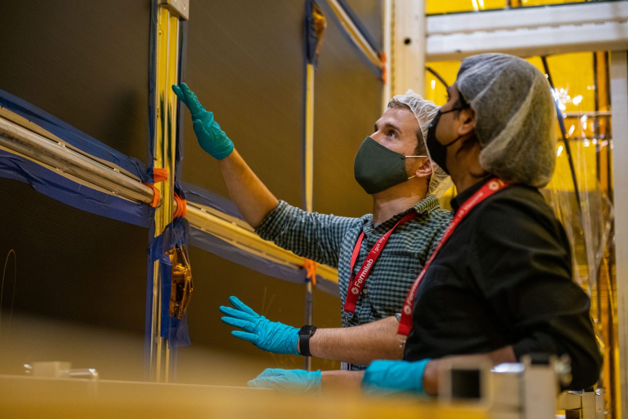 9 月,Will Foreman (IIT) 和 Vishvas Pandey (U Florida) 討論了安裝光擴散器以校準光子檢測系統的問題。照片:Ryan Postel,費米實驗室