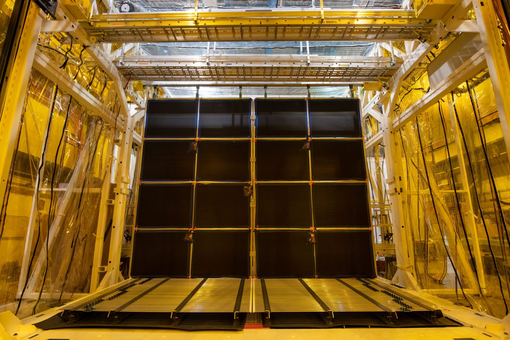 在探測器的中間,一個覆蓋著反射箔的垂直平面將作為陰極。組裝團隊于 7 月下旬將重陰極平面降低到探測器鋼架中的適當位置,并預計在 10 月初安裝第一個陽極平面。在安裝之前,每個光敏層都保持在一個特殊的受控清潔區域。