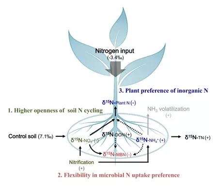 沈陽生態所土壤化學組依托額爾古納森林草地過渡帶生態研究站2014年5月建立的草地氮添加試驗平臺(尿素,10 g N-2 yr-1,δ15N = -3.4‰),系統研究了5個優勢植物13C(碳13)與15N(氮15)、土壤有效氮(NO3-、NH4+及DON)15N的自然豐度,及其對氮添加的響應規律。研究發現,氮添加對各優勢植物物種δ13C無顯著影響,而植物群落水平混合凋落物的δ13C下降,指征氮添加提升了羊草(13C貧瘠物種)的生物量占比。無外源氮添加下,優勢物種與土壤微生物分別偏好吸收NO3-與DON(通過δ15N接近程度判別);氮添加導致優勢物種與微生物的δ15N下降,與δ15N-NO3-的數值接近且變化趨勢一致,而與δ15N-NH4+、δ15N-DON變化趨勢相反,表明氮添加使植物與微生物的氮偏好趨同于NO3- (圖1);此外,氮添加使植物生物量增加、微生物生物量下降,可能說明植物與微生物間氮競爭加劇。