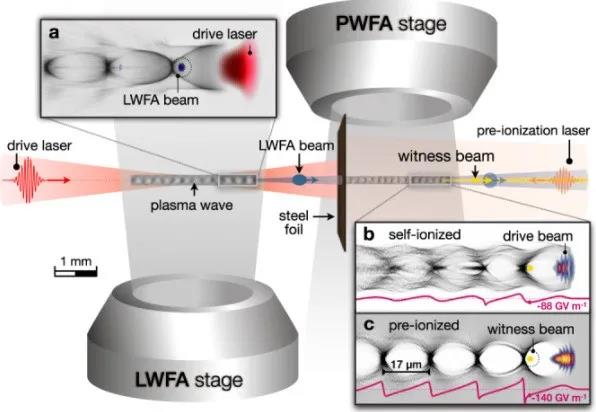 在下一段中,進(jìn)入的電子束遇到氫氣和氦氣的混合物,它可以在其中產(chǎn)生新的第二種等離子體波,在僅幾毫米的跨度內(nèi)使其他電子進(jìn)入渦輪模式——發(fā)射出高能粒子束。在這個過程中,研究人員使用一個額外的、更弱的激光脈沖預(yù)電離等離子體,使得驅(qū)動光束的等離子體加速更加有效。