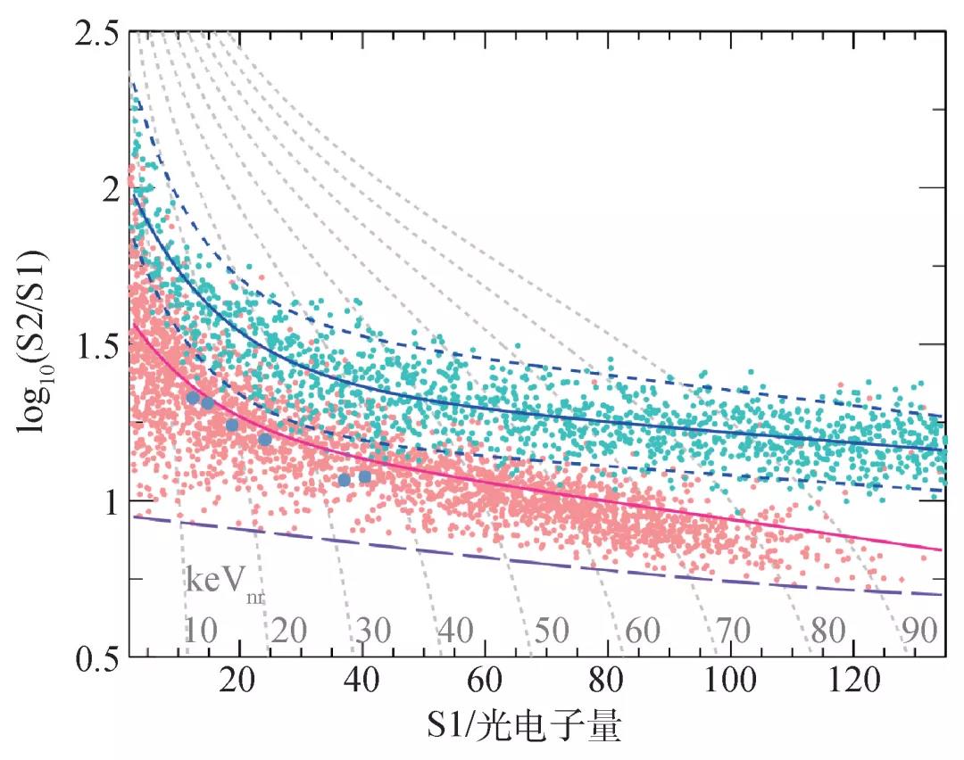 S1與S2同時攜帶反沖能量的信息。同時,TPC是一個有著高靈敏位置重建能力的探測技術(shù):S1、S2在時間上的差異為電離電子漂移時間,隱含事例位置的在漂移方向的信息;而S2在頂部PMT上的分布可以重建出事例發(fā)生的水平位置。高精度的位置重建使探測器具備了“自屏蔽”的能力。此外,同時探測S1和S2具有很強的本底辨別能力:暗物質(zhì)信號產(chǎn)生的核反沖與伽馬本底產(chǎn)生的電子反沖相比,將會產(chǎn)生更大的電離密度從而導致更大的重結(jié)合概率,因此會有較小的S2/S1比例。圖3展示了PandaX-4T實驗測得的電子反沖和核反沖不同的信號響應(yīng)。