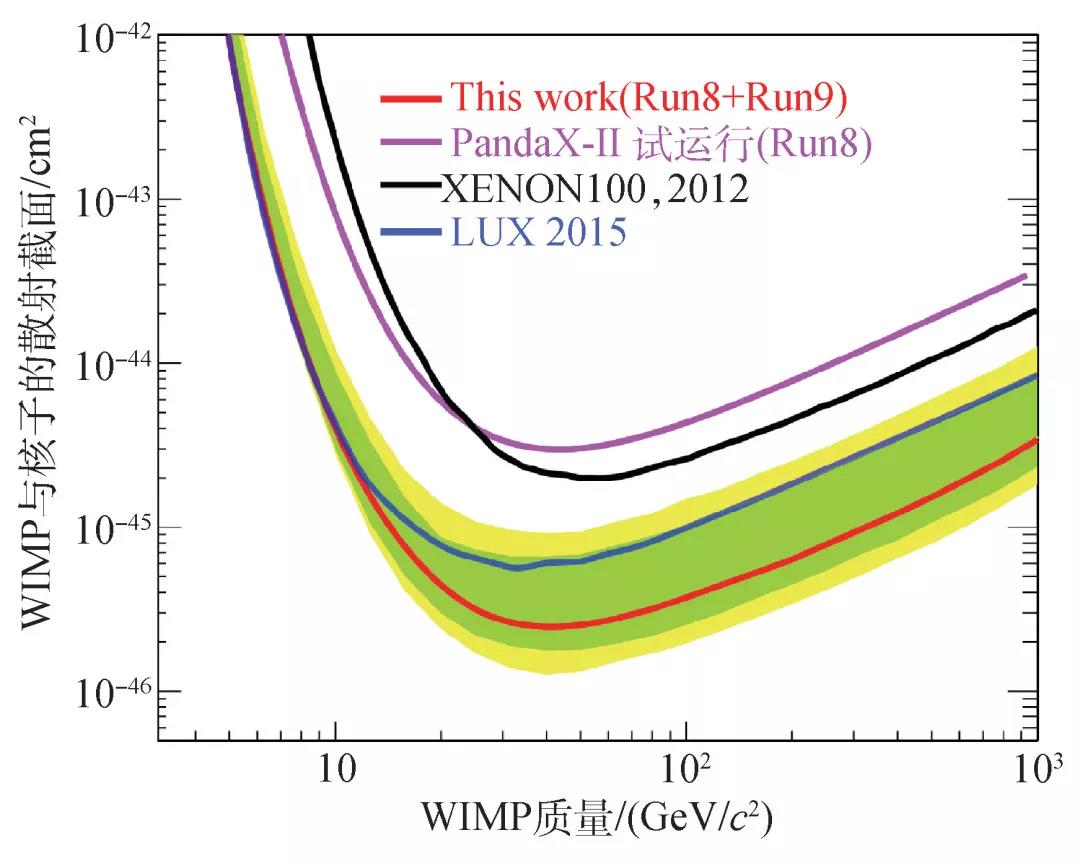 第二代580公斤級PandaX-II實驗,在同美國、歐洲實驗的激烈競爭中,兩度取得暗物質(zhì)和核子相互作用國際領(lǐng)先的限制,發(fā)表《物理評論快報》文章6篇[14,15,25—28],他引1500余次,并且入選2016年度《科技導報》十大科學進展和2017年度美國物理學會亮點。圖7給出了2016年《物理評論快報》中PandaX-II低本底運行首個80天暗物質(zhì)探測結(jié)果,這是當時世界上正式發(fā)表的靈敏度最高、曝光量最大的液氙暗物質(zhì)探測結(jié)果,對暗物質(zhì)粒子的性質(zhì)作出了最強的限制,可以看出,這個結(jié)果比美國LUX的探測結(jié)果在大質(zhì)量區(qū)提升了近3倍。此外,相比于PandaX-I,最低排除點從1.01×10-44 cm2@44.7 GeV/c2降低至2.5×10-46 cm2@40 GeV/c2,對于散射截面的限制增強了將近兩個數(shù)量級。