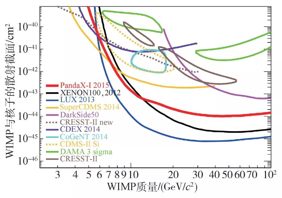 從理論的角度來看,盡管粒子物理標準模型取得了巨大成功,但是標準模型仍存在缺陷,比如無法自然地解釋希格斯粒子質(zhì)量如此之小,也無法解釋不同費米子間質(zhì)量的巨大差異等。理論學家普遍認為存在超出粒子物理標準模型的新理論。自20世紀下半葉起,理論學家就發(fā)展了例如時空超對稱、額外維度等新物理模型,彌補標準模型的不足。很多這類理論都預測暗物質(zhì)是一種新的基本粒子,質(zhì)量大約在電弱對稱性破缺的能區(qū)(百GeV/c2至數(shù)個TeV/c2量級,類比一個質(zhì)子質(zhì)量約為0.938 GeV/c2),并且與普通物質(zhì)有微弱的微觀相互作用。這類暗物質(zhì)粒子也被統(tǒng)稱為“弱相互作用重粒子”(weakly interacting massive particles,簡稱WIMPs)。新物理模型中的WIMPs和普通物質(zhì)的微弱相互作用,恰好可以使它們在早期宇宙脫離熱平衡,產(chǎn)生今天宇宙中觀測到的暗物質(zhì)密度!這樣“一石二鳥”解決粒子理論和宇宙學基本問題的“巧合”,也被稱為是“WIMPs奇跡”[1],賦予了WIMPs極強的科學吸引力。1985年,Witten和Goodman首次提出,在深地極低本底實驗室通過高靈敏度探測器來搜尋WIMPs與原子核碰撞的反沖信號便可以“直接探測”WIMPs[2]。這個看似簡單的探測原理一直在激勵著全球許多實驗對暗物質(zhì)粒子開展探測。國際上空間站的暗物質(zhì)間接探測也非?;钴S。間接探測是指對宇宙中暗物質(zhì)粒子湮滅產(chǎn)生的穩(wěn)定的末態(tài)粒子進行探測從而實現(xiàn)對暗物質(zhì)粒子的尋找和研究。實驗通常在太空中進行,可以顯著減少地球大氣層的干擾,例如丁肇中先生領(lǐng)導的阿爾法磁譜儀AMS-02實驗[3]和我國的“悟空”(DAMPE)暗物質(zhì)衛(wèi)星[4],它們都在TeV能區(qū)的高能(正)電子譜中觀察到異常,或許和銀河系中WIMPs湮滅信號有關(guān)聯(lián)。