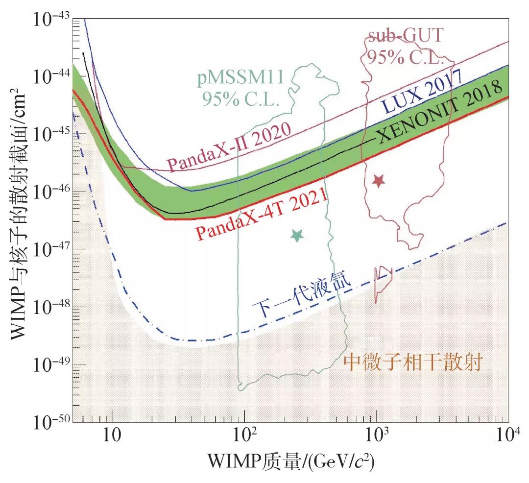 而今,美國的LZ(7噸)實驗和歐洲的XENONnT(6噸)實驗也在緊鑼密鼓的進行中[31]。為了能夠抓住發(fā)現(xiàn)暗物質(zhì)的契機,在進行PandaX-4T實驗的同時,合作組也在籌劃下一代更靈敏的實驗,希望可以觸及來自于太陽和大氣中微子帶來的所謂“中微子地板”(圖8中微子相干散射淡灰色區(qū)域上方的邊界線就是“中微子地板”),對WIMP模型做出決定性判斷。下一代PandaX實驗的規(guī)劃是建設(shè)一個數(shù)十噸級可以逐步升級的探測器。它也將開展多個物理目標的研究:30噸的天然氙中將有2.7噸有效質(zhì)量的氙-136,加上液氙探測器高靈敏度的性能和對本底的“自屏蔽”抑制,可以以極高靈敏度開展NLDBD的研究尋找有效質(zhì)量至15 meV/c2的馬約拉納中微子;它也可以測量和研究來自于太陽、大氣層和古老超新星爆發(fā)產(chǎn)生的中微子。