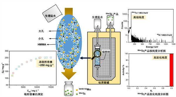 中科院近代物理研究所核化學室科研人員,提出了一種具有更大比表面的大孔/介孔等級孔γ-氧化鋁新型材料(Hierarchically Macro/Mesoporous γ-Al2O3, HMMA),并應用于低比活度99Mo/99mTc發生器的制備。吸附研究表明HMMA對Mo的吸附容量可達到250 mg g-1,而傳統裂變型99Mo/99mTc發生器所用的普通γ-氧化鋁對Mo吸附容量僅為2-20 mg g-1。同時,應用HMMA制備的低比活度99Mo/99mTc發生器,可實現99mTc的長期高效淋洗(99mTc的回收率約89 %)。99mTc產品收集體積僅需約 6 mL,具有較高放射性濃度。通過對產品的質檢,99mTc產品具有高核純度和放化純度,有利于后續藥物的標記。在此基礎上,將淋洗的99mTc與常用的MDP(MIBI)進行了標記,標記率和放化純度可達96%以上。值得一提的是,我們成功回收了價格昂貴的100/98Mo,回收率高達95%。最后,通過多種表征手段,從本質上解釋了Mo離子同時與γ-氧化鋁和HMMA表面的羥基相互作用機制。另外,HMMA合成工藝簡單、效率高并且成本低,非常適用于大規模低比活度99Mo/99mTc發生器的制備。