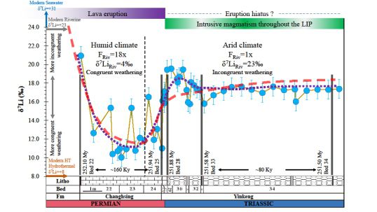 該研究表明,在滅絕事件發生前夕,海水的Li同位素組成發生了顯著的降低(圖1),這一特征一直持續到了早三疊世初,指示了當時快速增強的全球性的大陸風化作用。同時,海水的Li同位素變化時段與地質歷史時期最大規模的火山作用——西伯利亞大火成巖省的噴發時間高度吻合,表明這一時期全球性風化作用的突變很可能源自于西伯利亞火山的大規模爆發。研究者們認為,巨量的基性溢流玄武巖噴發至地表、火山噴發造成的溫室氣體濃度急劇升高、全球性的酸雨氣候等為全球性陸地風化作用增強提供了必要的條件。