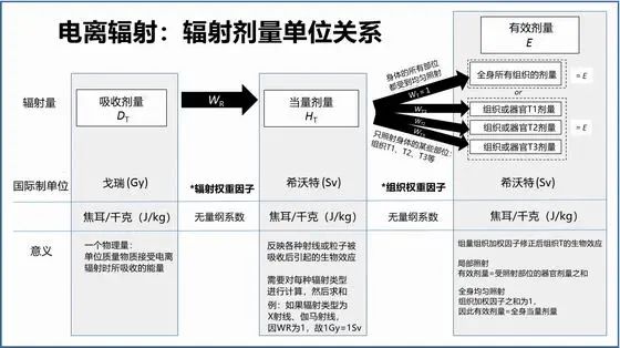 電離輻射本質(zhì)是一種能量傳播,當(dāng)1公斤體重人體吸收1焦耳的輻射能量即為1戈瑞(Gy),但1Gy的輻射劑量可能會(huì)引起人體不同的生物效應(yīng),這與輻射的類型和人體受照射組織器官的輻射敏感性有關(guān),像質(zhì)子和中子就比放射檢查(多數(shù)為X射線)和核醫(yī)學(xué)檢查(多數(shù)為伽馬射線(γ射線))產(chǎn)生的輻射生物效應(yīng)強(qiáng),而甲狀腺、眼晶體和性腺就比人體四肢更“脆弱”,對(duì)輻射更加敏感,因此,我們需要一個(gè)單位來(lái)衡量輻射生物效應(yīng)的強(qiáng)弱,那就是國(guó)際單位希沃特(Sv),也是當(dāng)量劑量和有效劑量(醫(yī)學(xué)專業(yè)術(shù)語(yǔ))的單位,具體之間的關(guān)系見(jiàn)下圖,小編不在贅述,因這個(gè)單位太大,臨床上常用毫希沃特(mSv)替代,1mSv=0.001Sv=1000μSv。