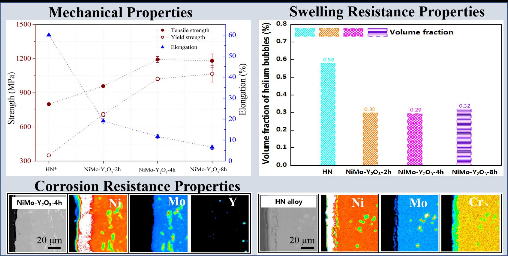 圖1. NiMo-Y2O3合金力學、抗氦致腫脹及耐腐蝕性能