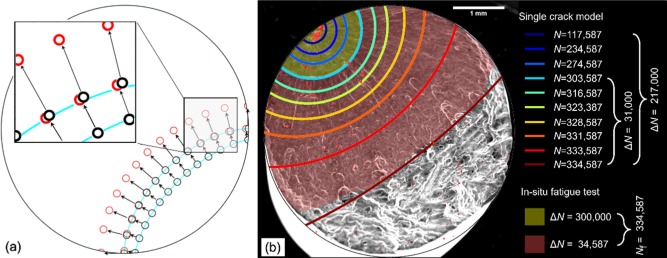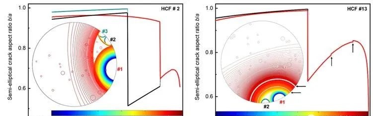 在兩個非絕對共面的裂紋擴展過程中,當兩個裂紋開始重疊時就會發生橋接韌帶的斷裂并在斷裂面上形成脊。表明長裂紋的穩定生長也伴隨著相鄰裂紋或缺陷的合并而不僅是單個裂紋的擴展。傳統單裂紋模型可以有效預測裂紋前沿縱橫比的演變和單裂紋擴展壽命,與單裂紋主導失效時的原位實驗結果吻合較好,但當多個缺陷協同誘導疲勞開裂時,將給出非保守的計算結果。