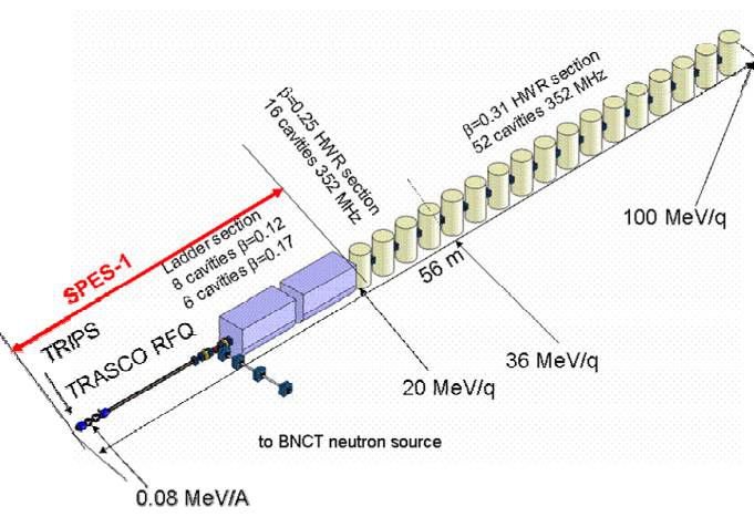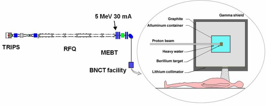 低能強(qiáng)流質(zhì)子加速器有很廣泛的用途,每一個高能質(zhì)子加速器背后都有一個或幾個低能強(qiáng)流質(zhì)子加速器。比如,意大利的核能研究機(jī)構(gòu)就想從用于核能研究(意大利ADS可行性研究項目)的高能質(zhì)子加速器的低能段引出5兆電子伏特的質(zhì)子,用來產(chǎn)生BNCT放療用的中子,見圖1。