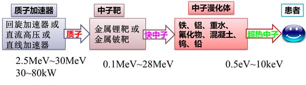 圖2 加速器BNCT原理示意圖(圖中數(shù)值為質(zhì)子或中子能量)