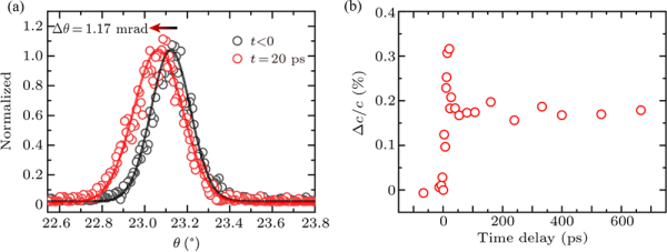 圖2 在光泵浦下超快X射線衍射信號隨延時的變化:(a)泵浦光作用20ps后勞厄衍射斑的角移;(b)不同的泵浦-探針延時,所對應的光致拉伸度