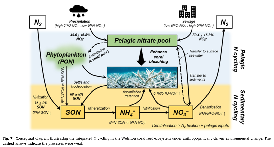 瑚礁是生產力最高的生態(tài)系統(tǒng)之一,近幾十年來一直在急劇下降。雖然研究認為珊瑚礁退化和人為氮負荷增加之間存在顯著相關性,但缺乏對這些重要生態(tài)系統(tǒng)中氮源和循環(huán)過程的定量描述。