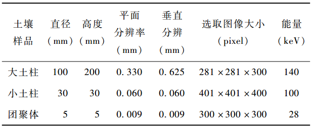 大土柱利用醫用CT( Discov-ery CT HD 750,GE , USA)掃描,小土柱利用工業顯微CT ( Phenix Nano-tom S, GE, USA)掃描,團聚體樣品應用同步輻射顯微CT進行掃描。圖像重建均采用背投影算法,利用不同CT自帶軟件完成,,詳細試驗參數見下表。此外,兩種顯微CT均輸出tiff格式圖像,而醫用CT輸出圖像為DICOM 格式,需要利用ImageJ軟件轉化為tiff格式。