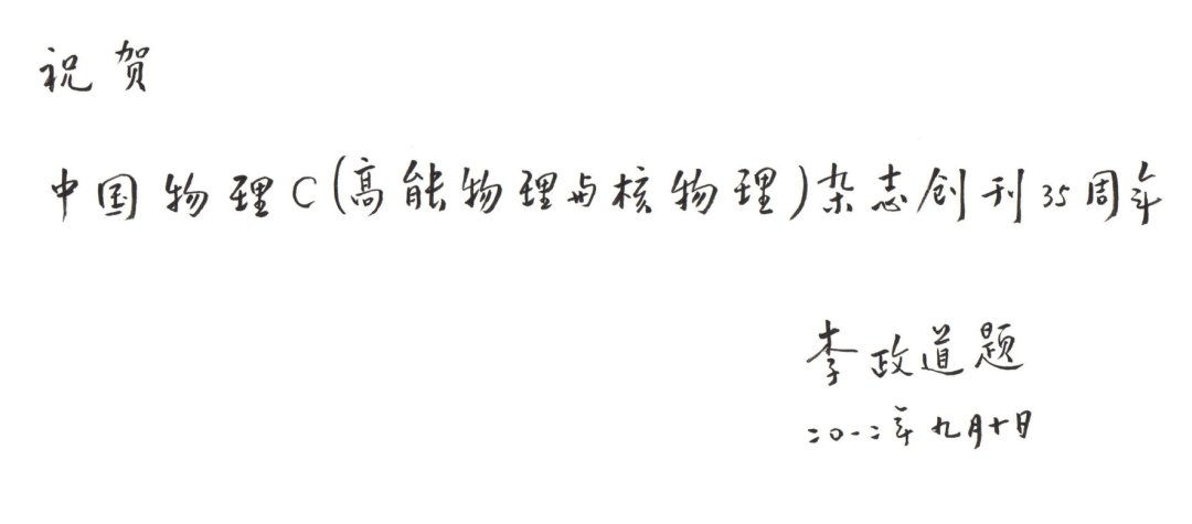 這里還要提及的是李政道先生對中國學術期刊的關懷,并親自為期刊撰寫論文的事。現以CPC雜志為例,這是中國高能物理與核物理的英文期刊,長期以來都為高質量的稿源發愁。2006 年的一天,我在參加高等科技中心的學術活動中見到李先生,說起國內學術期刊的苦衷:好文章都發往國外了,國內雜志很難吸引到高水平的文章。趁此機會我向他介紹了CPC學術期刊,并以主編的名義向他約稿。他問了我幾個有關期刊的問題后,要我把近期出版的期刊先寄給他看看。于是我馬上照辦了。沒過多久,他將一篇與同事合作完成的重要論文:A Possible Relation between the Neutrino Mass Matrix and the Neutrino Mapping Matrix寄來,向CPC投稿。我們喜出望外,經過正常的審校程序后,用最快的時間發表了。發表后引用率非常高,影響很大。以后李先生又陸續寫了兩篇論文投來,發表后都有很高的引用率。2012 年,恰逢CPC創刊35 周年,我們請李先生題詞紀念。他欣然同意,不久就將題詞寄來,并還寫信祝賀。李先生題詞在期刊上發表后影響極大。在李先生帶動下,期刊不斷收到一些高水平的文章。以后我們又獲得了AME(原子質量評估)和PDG(粒子數據表)的刊載權,使雜志上了一個新臺階。2015 年CPC的影響因子達到3.76,比前幾年的0.3 提高了十倍還多。這標志著CPC 已進入國際物理優秀期刊行列?,F在CPC 已成為國際高能物理界公認的一流雜志。大家不會忘記李先生在我們期刊困難時所給予的支持和投稿。
