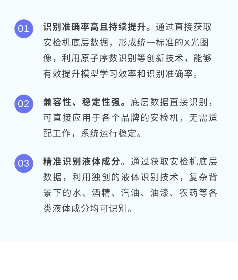 這種方案的優勢在于各個品牌安檢機的底層數據差異小且容易標定,可經過處理形成統一標準的X光圖像,更易于深度學習模型進行學習和識別,從而能夠大幅提升模型訓練的效率,有效提高模型識別準確率,徹底解決系統兼容性、適配性難題,且能夠準確識別各種液體成分。