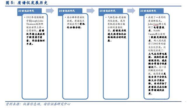質(zhì)譜儀從 20 世紀(jì) 20 年代出現(xiàn)已有近百年發(fā)展歷史,一開始用于測(cè)量原子質(zhì)量,隨著高分辨率質(zhì)譜儀出現(xiàn)用于有機(jī)化合物分析,隨后氣相色譜-質(zhì)譜連用儀出現(xiàn)開始應(yīng)用到天然有機(jī)化合物結(jié)構(gòu)分析,20 世紀(jì) 80 年代離子源技術(shù)獲得快速發(fā)展,質(zhì)譜儀開始應(yīng)用到生物醫(yī)學(xué)領(lǐng)域。